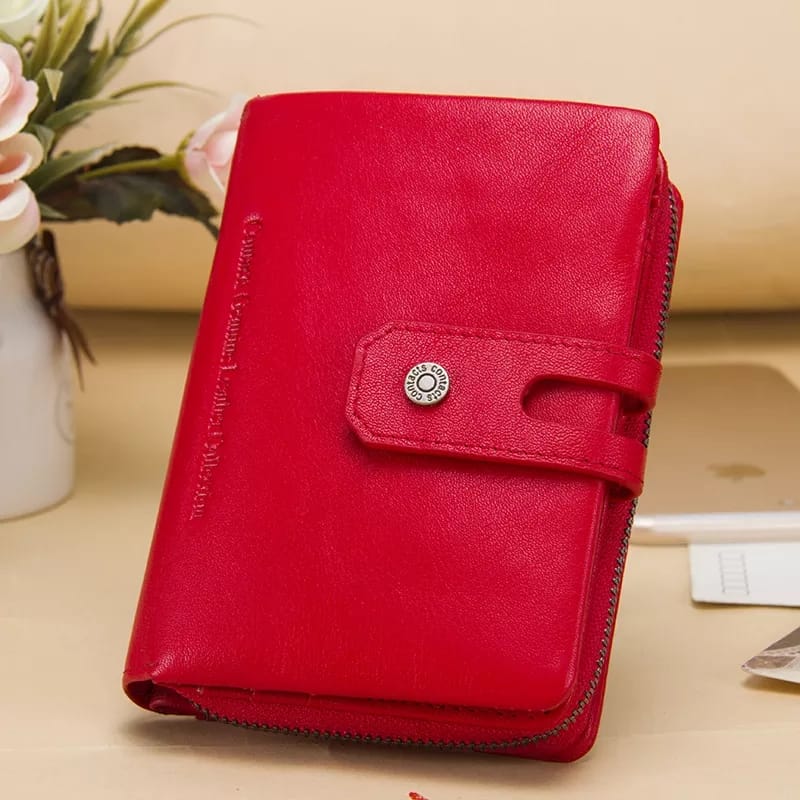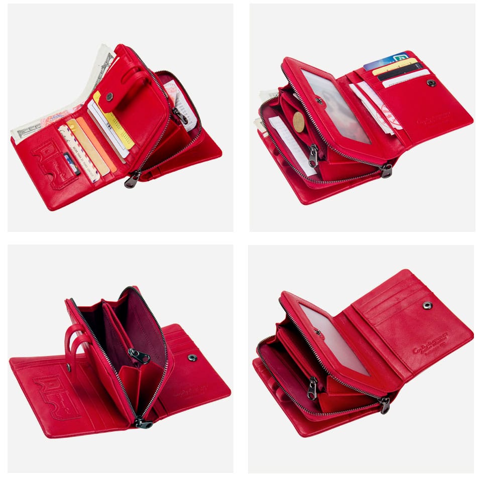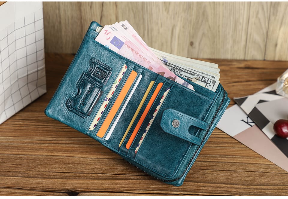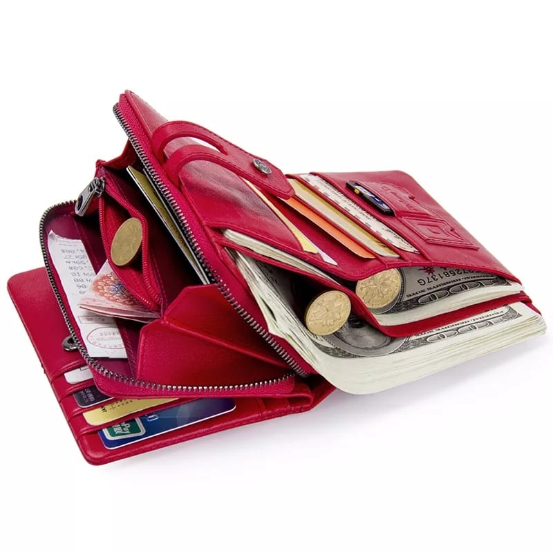 Cuenta con protección RFID, 2 compartimentos para billetes, un monedero monedero y múltiples compartimentos para tarjeta.